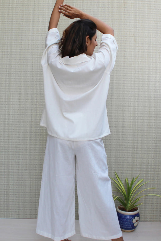 This white oversized half sleeve shirt combines comfort and style with its relaxed fit and breathable fabric. Featuring natural wooden buttons and a practical chest pocket, it offers a subtle yet distinctive detail that enhances its minimalist design. Ideal for casual or smart-casual occasions,...- $48.50