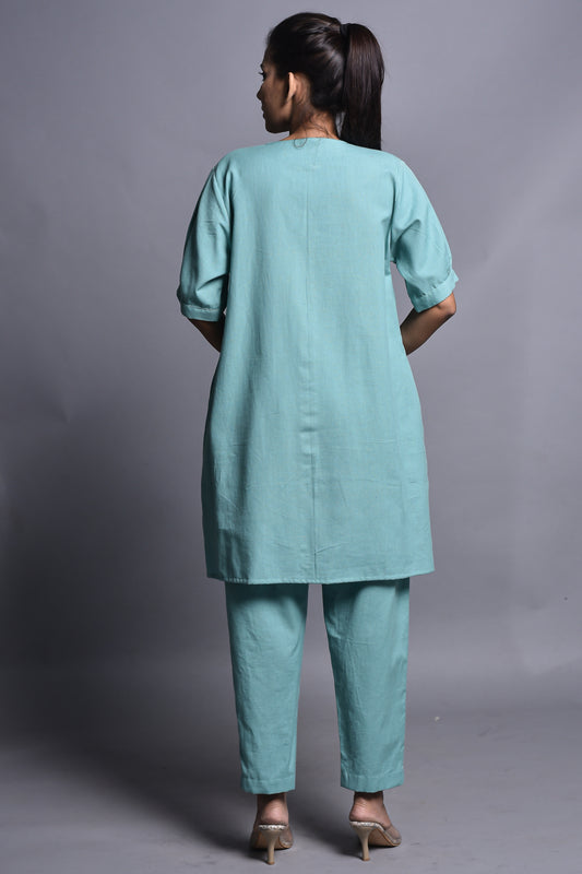 Pastel Green Straight Cut Kurta with V Notch Neckline and Roll-Up Sleeves
