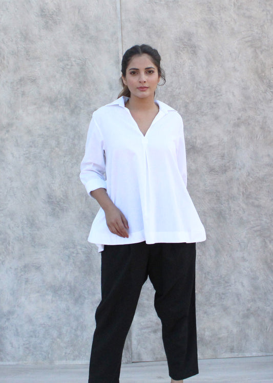White Long-Sleeve Flared Shirt with Front Pleat Detail