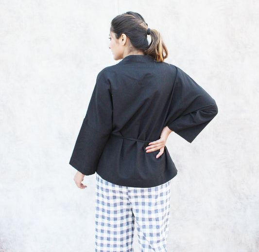 Black Wrap-Style Linen Top with Waist Tie and 3/4th Sleeves
