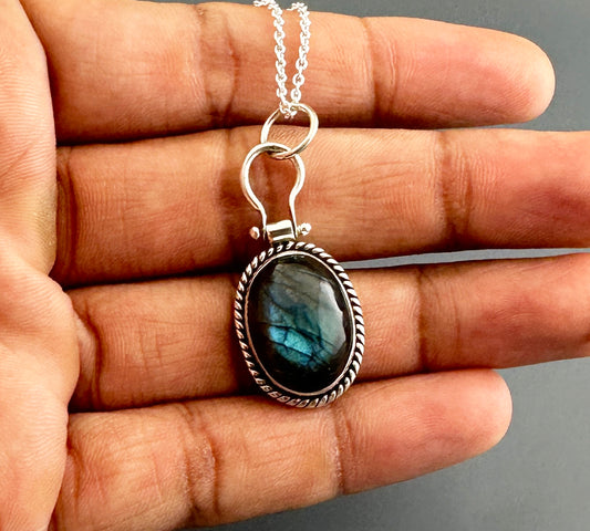 Description Natural Birthstone of February and March Labradorite regulates metabolism, lowers blood pressure, relieves menstrual tension and balances hormones . Labradorite treats colds, and rheumatism, and aids in digestion.✦Gemstone: Natural Labradorite✦Stone Cut: Oval Cabochon 13X18 mm✦Pendant Length: Approximately 2.5 cm with loop✦Metal: 925 Sterling...- $34.00