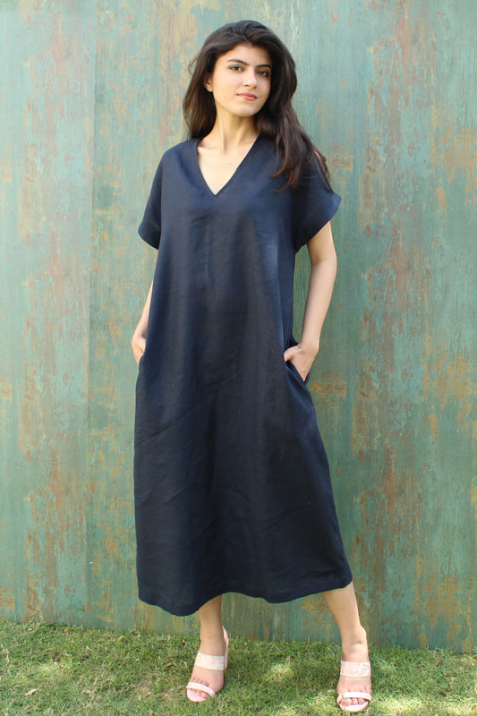 Details Knee-length linen dress with a relaxed silhouette V-neckline with a soft front pleat for subtle shaping Half sleeves offering easy movement and casual comfort Functional side pockets for everyday practicality **Looking for something unique? We specialize in custom creations tailored to your vision.- $72.00