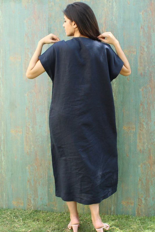 Navy Blue Button-Down Linen Shirt Dress
