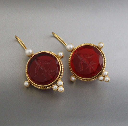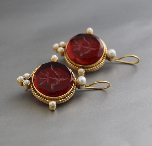 Red Intaglio Dainty Gold Earrings, Vintage Earrings - Red