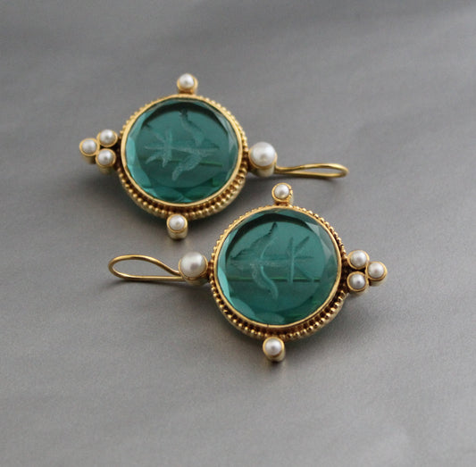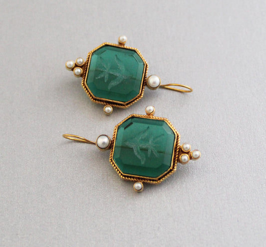 Green Intaglio Earrings, Ancient Victorian Earrings - Green