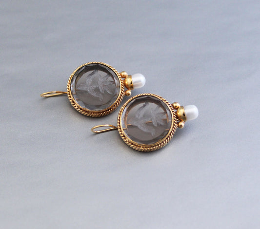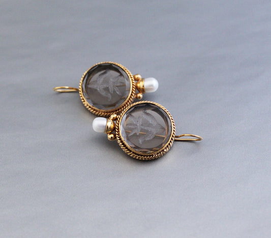 Smokey Glass Intaglio Vintage Earrings - Smokey