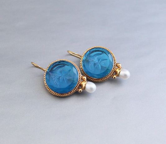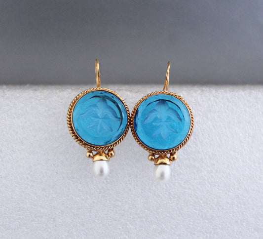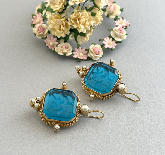Topaz Blue Glass Intaglio Vintage Earrings - Topaz Blue