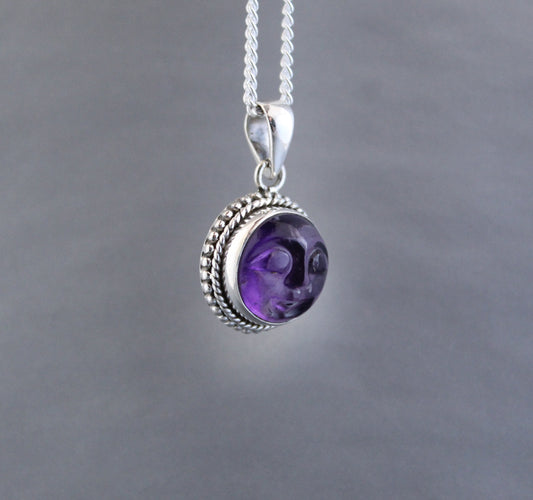 Description Beautiful Natural Amethyst NecklaceA rich purple color, and simple, classic mounting,Amethyst is the birthstone of FebruaryPerfect for any kind of outfit and every occasion. ✦Gemstone: Natural Amethyst✦Stone Cut: Round Carved✦Stone Size: Approximately 13-15 mm Round✦Metal: 925 Sterling Silver Natural stones may vary slightly...- $34.00