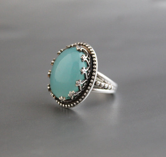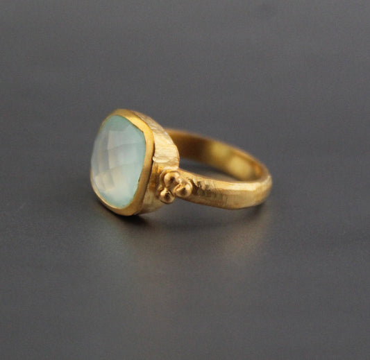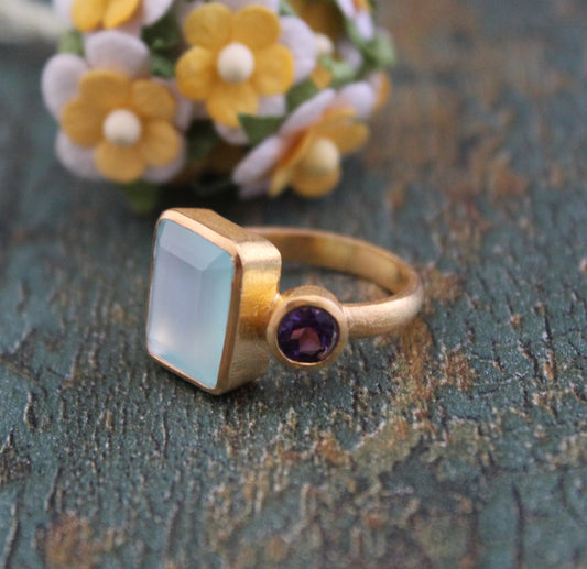 Description Chalcedony is a nurturing stone that promotes brotherhood and good will. It absorbs negative energy. It brings the mind, body, emotions and spirit into harmony.Natural Aqua Chalcedony Ring. Please select size from drop down menu.✦Gemstone: Natural Aqua Chalcedony with Amethyst✦Stone Cut: Rectangle Cut✦Stone...- $34.00