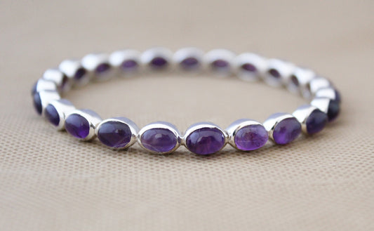 Description Amethyst Bangle, Natural Purple Amethyst Bracelet, Sterling Silver, Silver Gemstone Bangles, Gemstone Bangles, Bezel Set BanglesBeautiful Natural Amethyst cabochon Bangle.?Gemstone: Natural Amethyst?Stone Cut: Cabochon?Stone Shape : 5X7 mm Oval cabochon?Bangle Width : Approximately 5 mm?Metal: 925 Sterling Silver Bangle Size ( Please confirm...- $84.00
