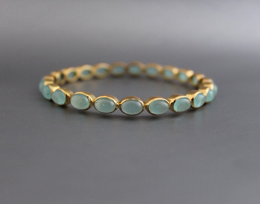 Description Beautiful Aqua Chalcedony cabochon Gold Plated Bangle.✦Gemstone: Aqua Chalcedony✦Stone Cut: Oval Cabochon✦Stone Shape : 5X7 Oval cabochon✦Bangle Width : Approximately 5 mm✦Metal: Micron Gold Plated Bangle Size ( Please confirm your size after viewing reference picture in the Listing )6 Inches Circumference -...- $88.00