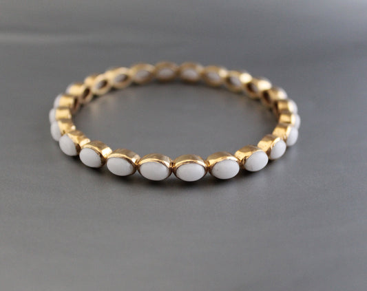 Description Beautiful White Agate Bangle ✦Gemstone: Natural White Agate✦Stone Cut: Oval Cabochon✦Stone Shape : 5X7 Oval cabochon✦Bangle Width : Approximately 6 mm✦Metal: Micron Gold Plated Bangle Size ( Please confirm your size after viewing reference picture in the Listing )6 Inches Circumference - 5...- $88.00