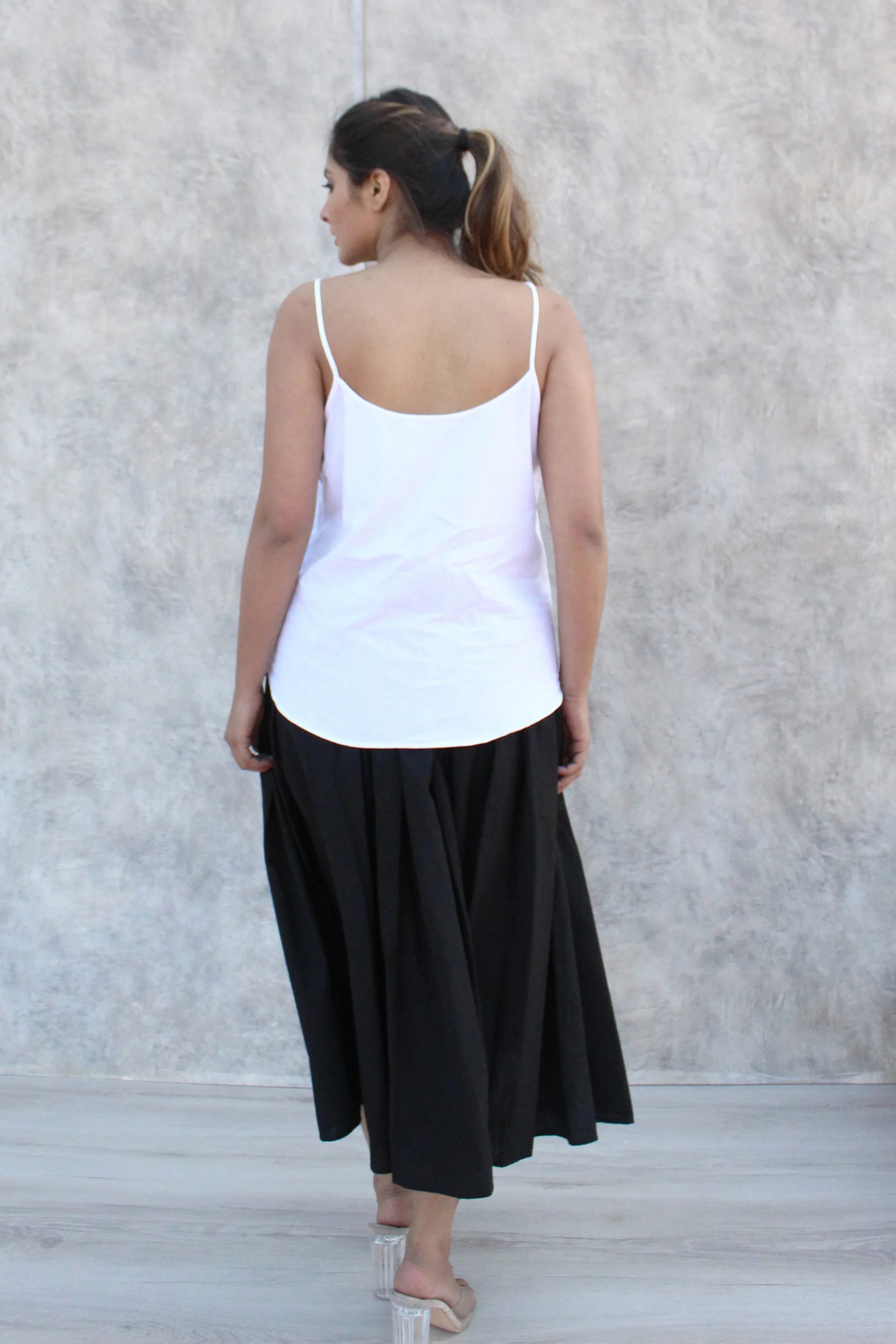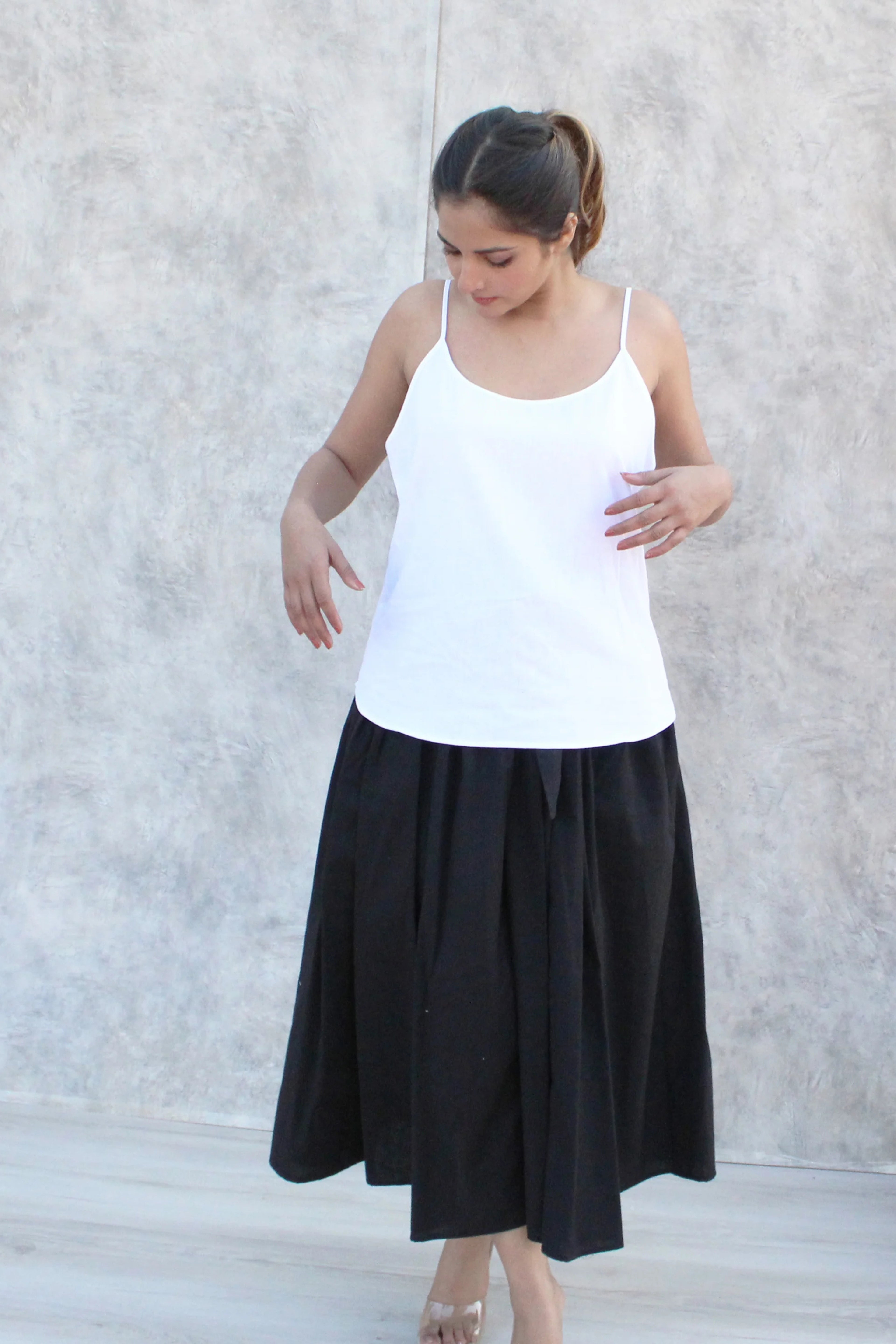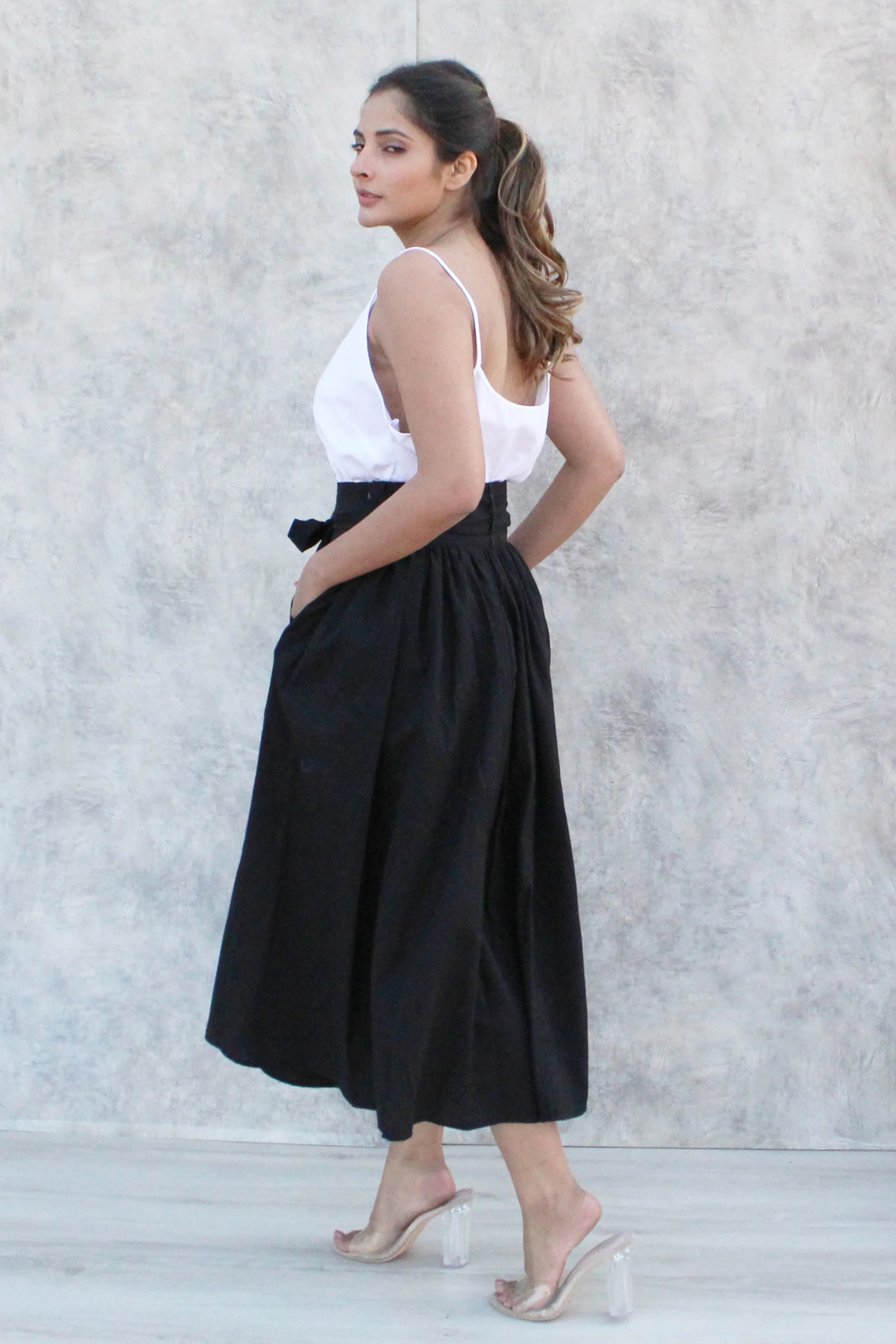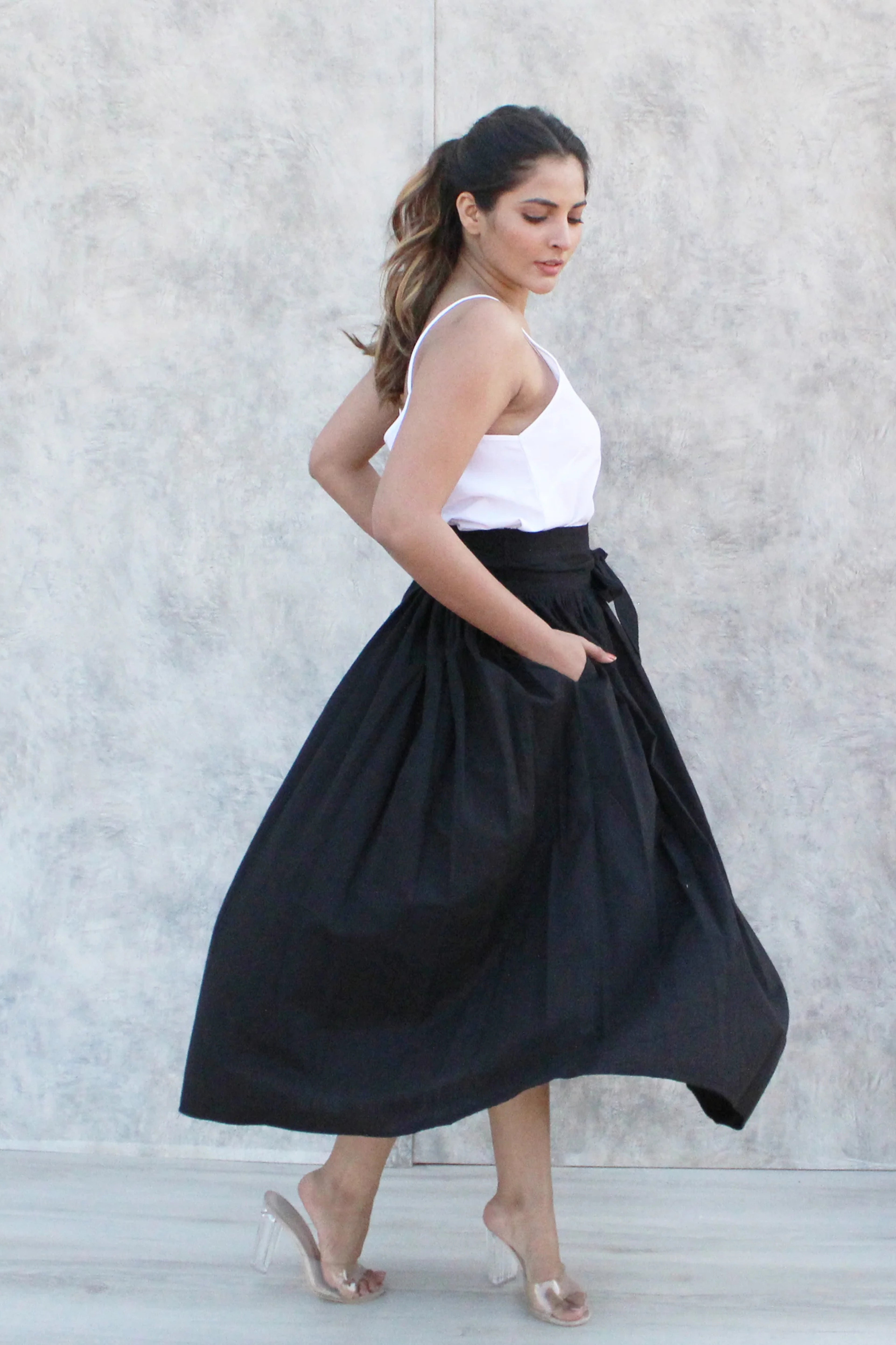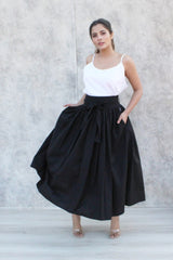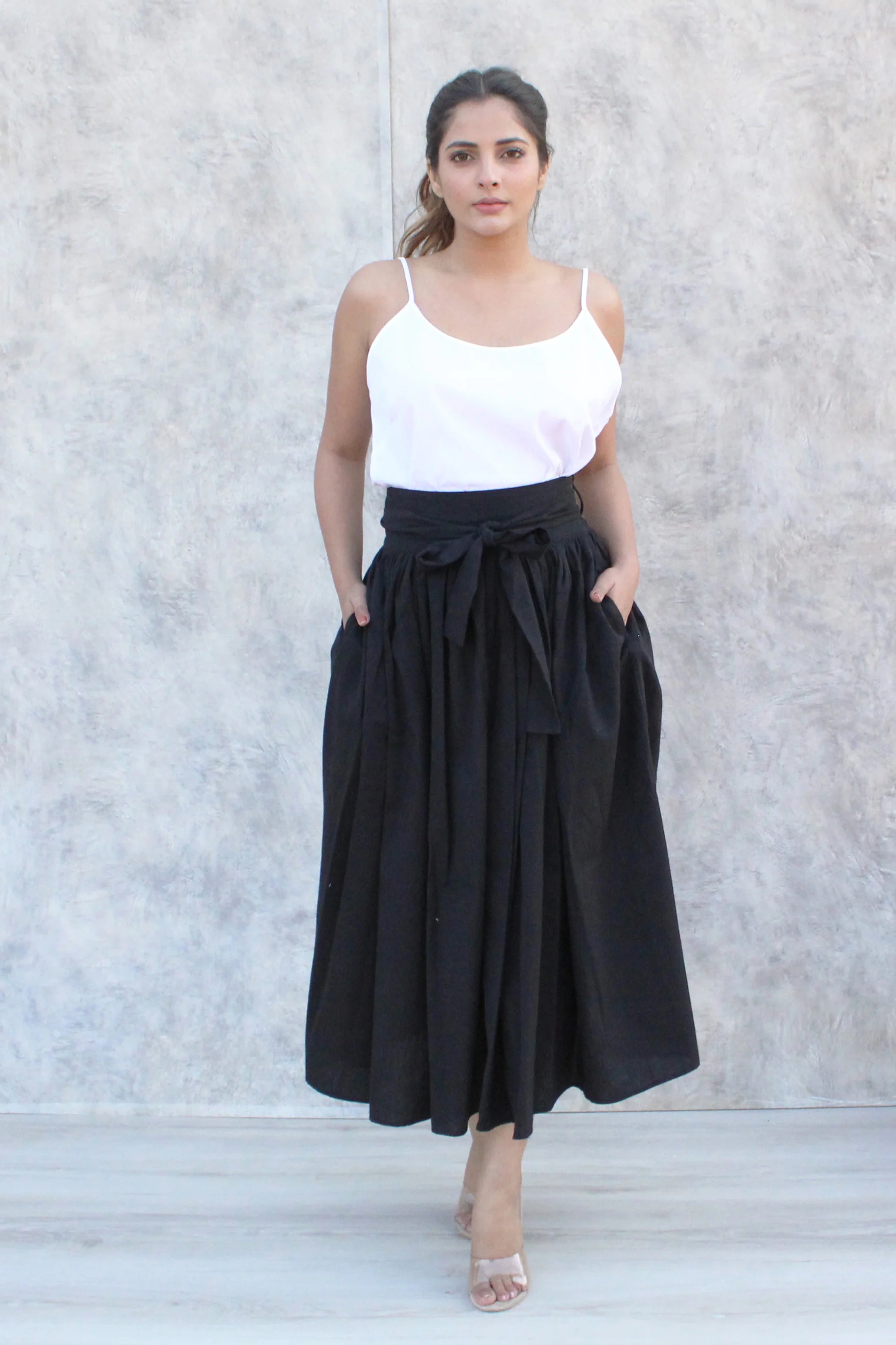 Black Mid-Calf Skirt with Waist Tie and Knife Pleats