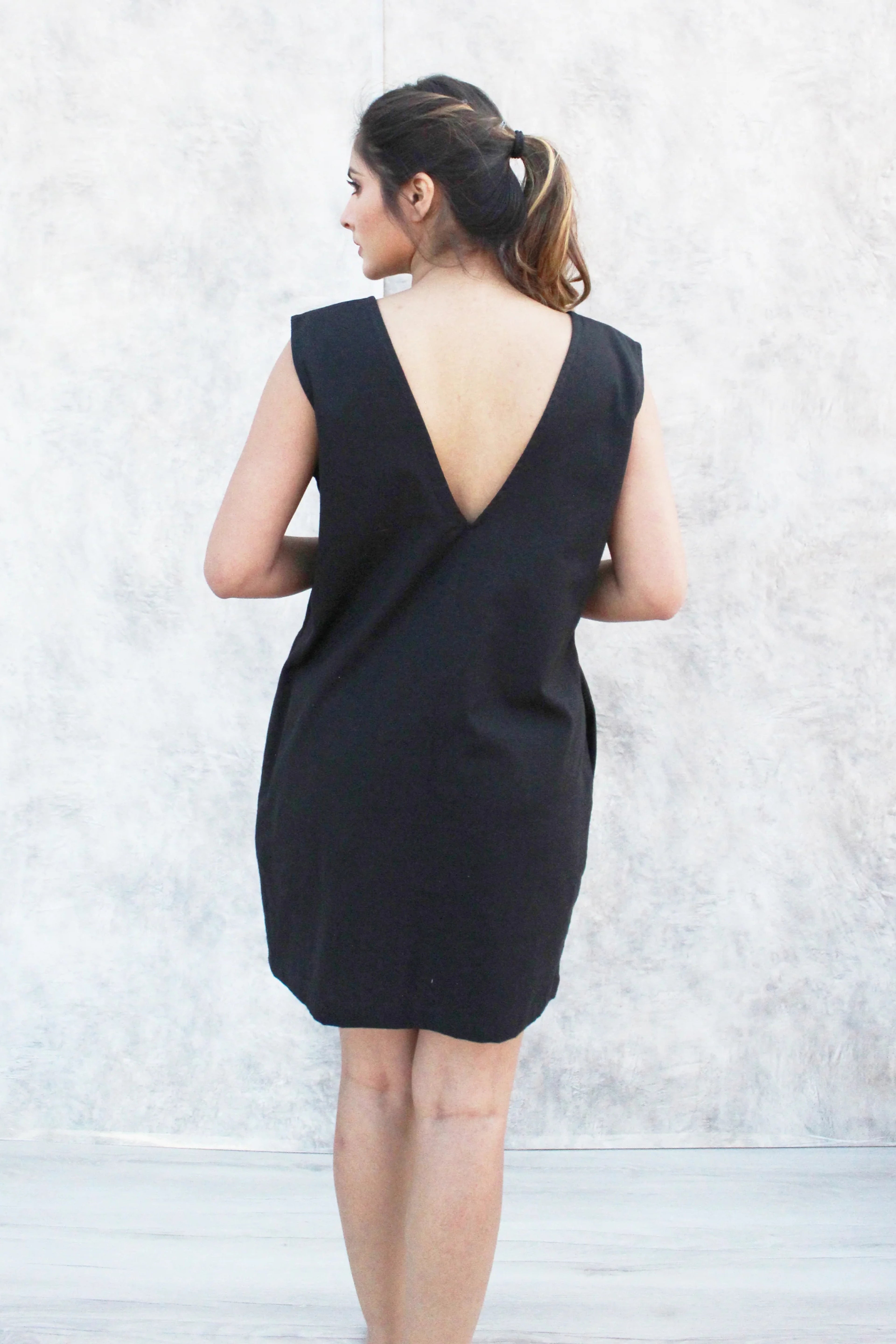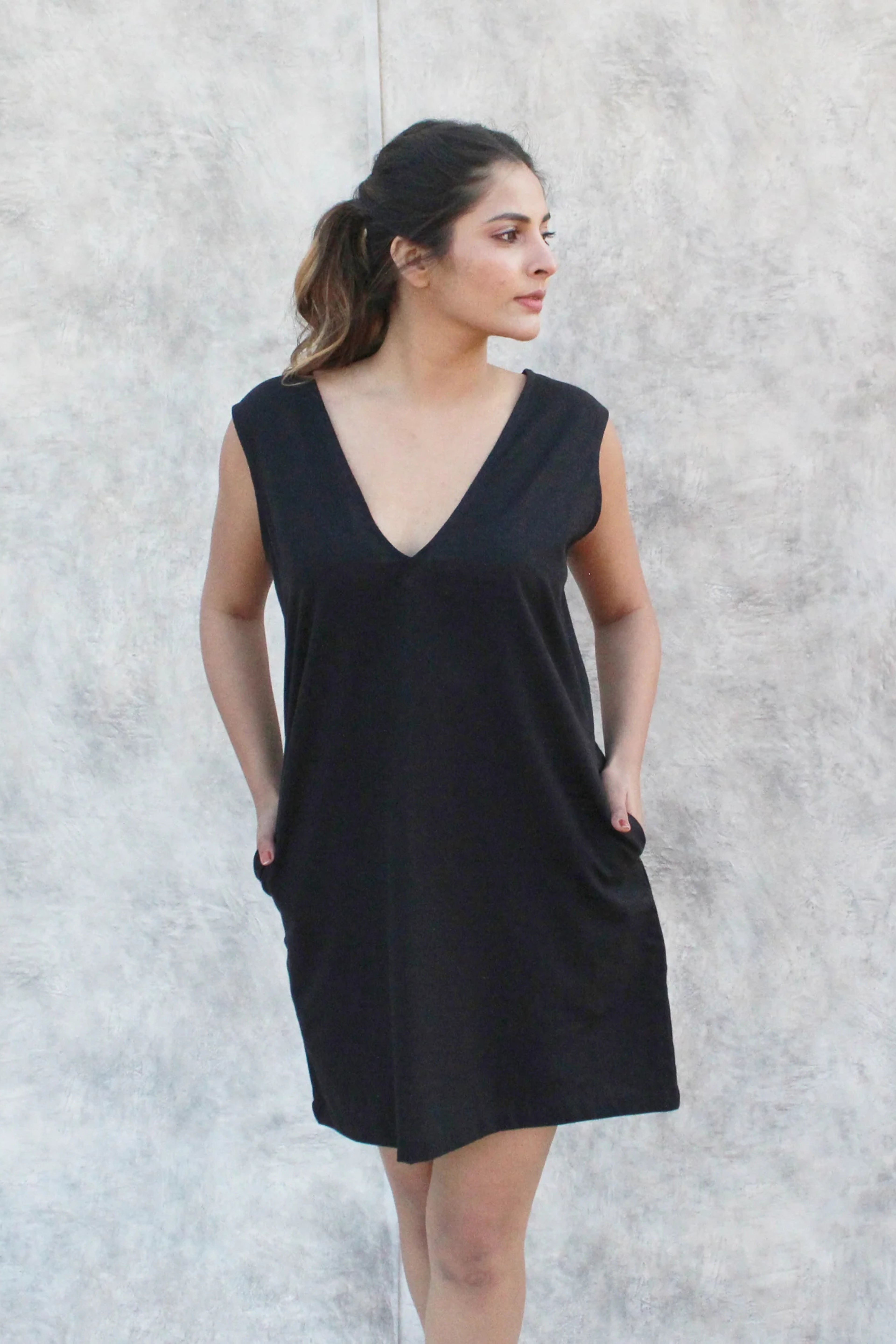 Black Sleeveless Mini Dress with Deep V-Neck and Pockets