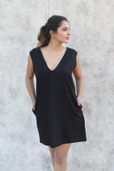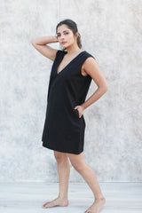 This black sleeveless mini dress features a deep V-neckline that adds a touch of sophistication, while its practical pockets offer convenience without compromising style. Crafted