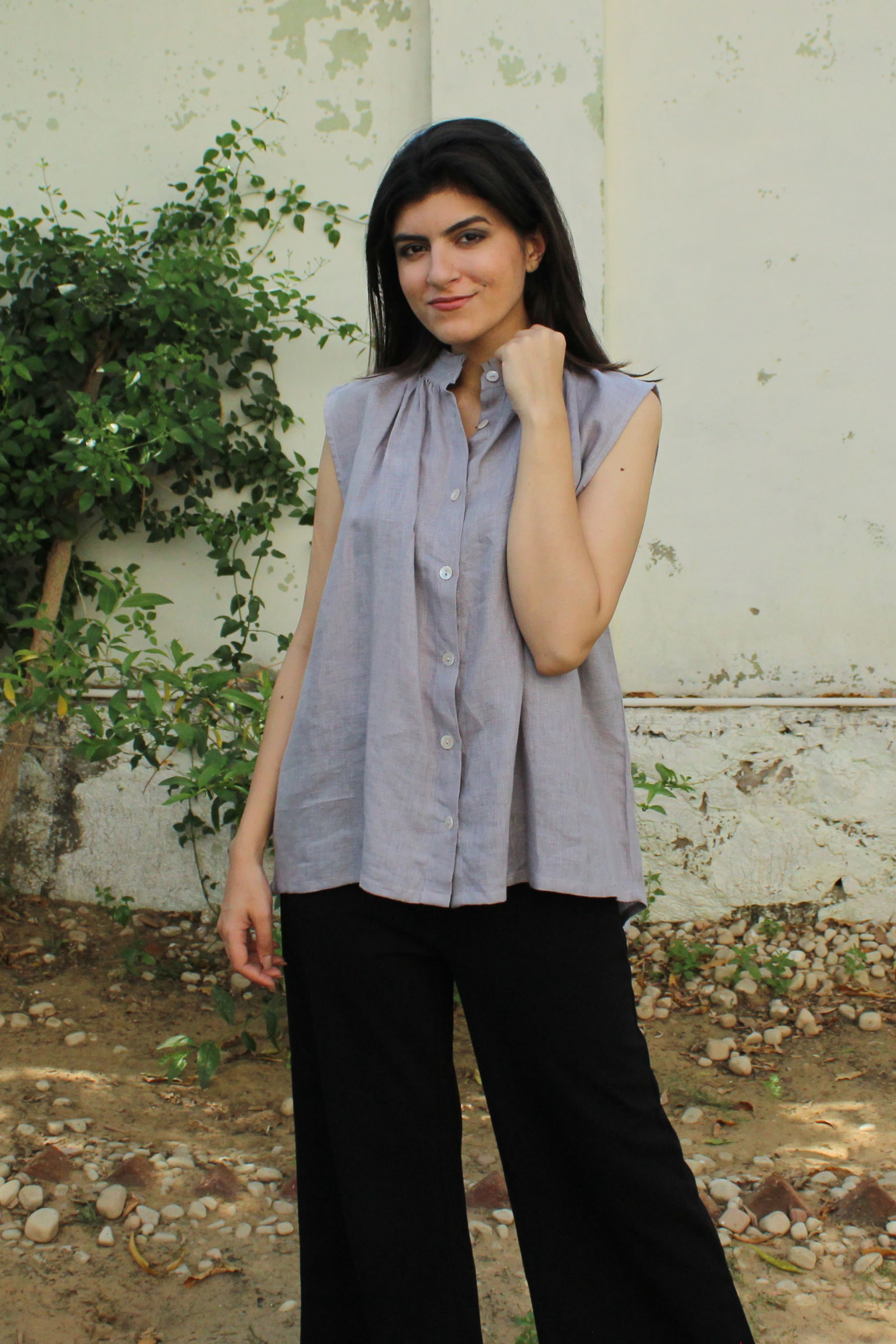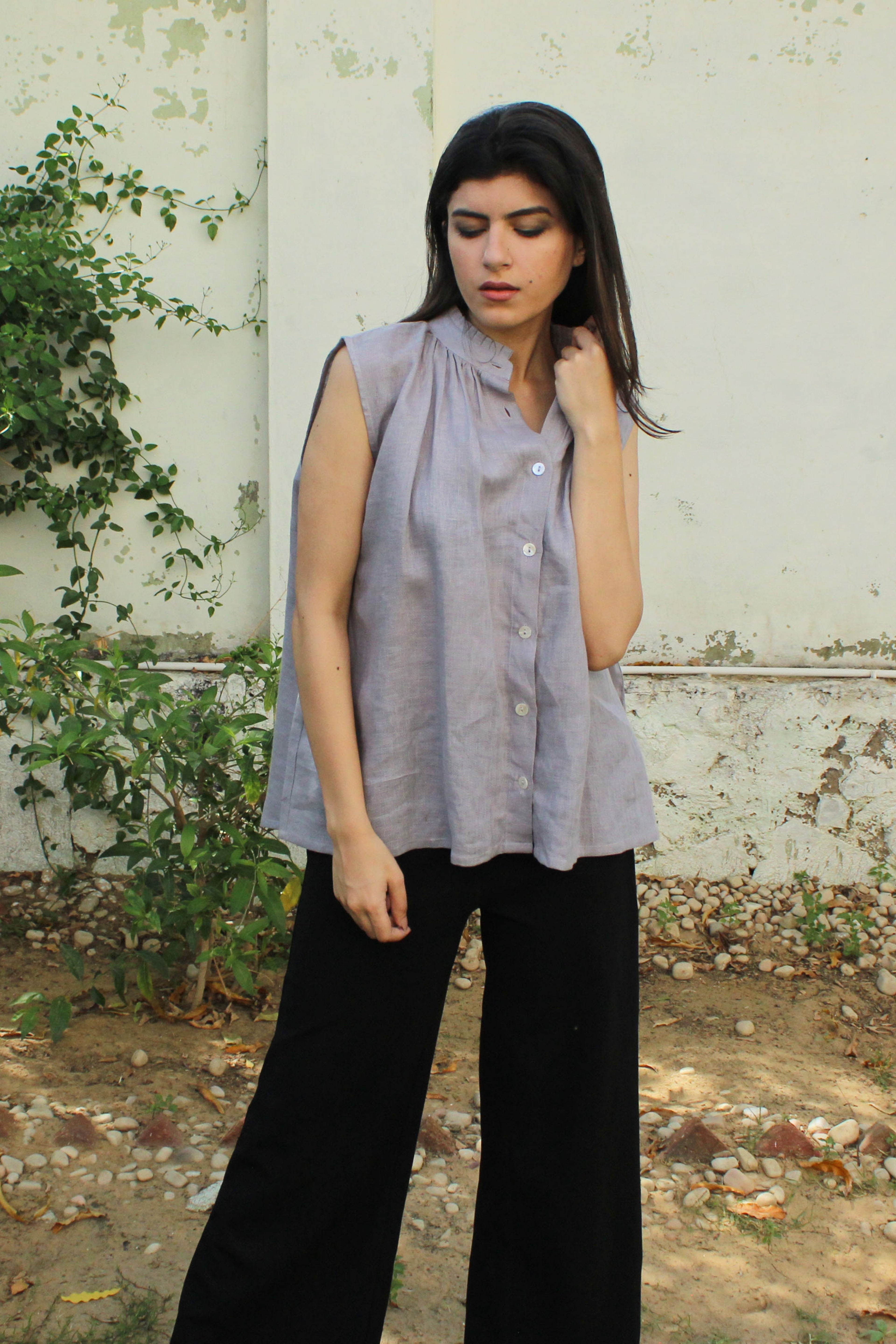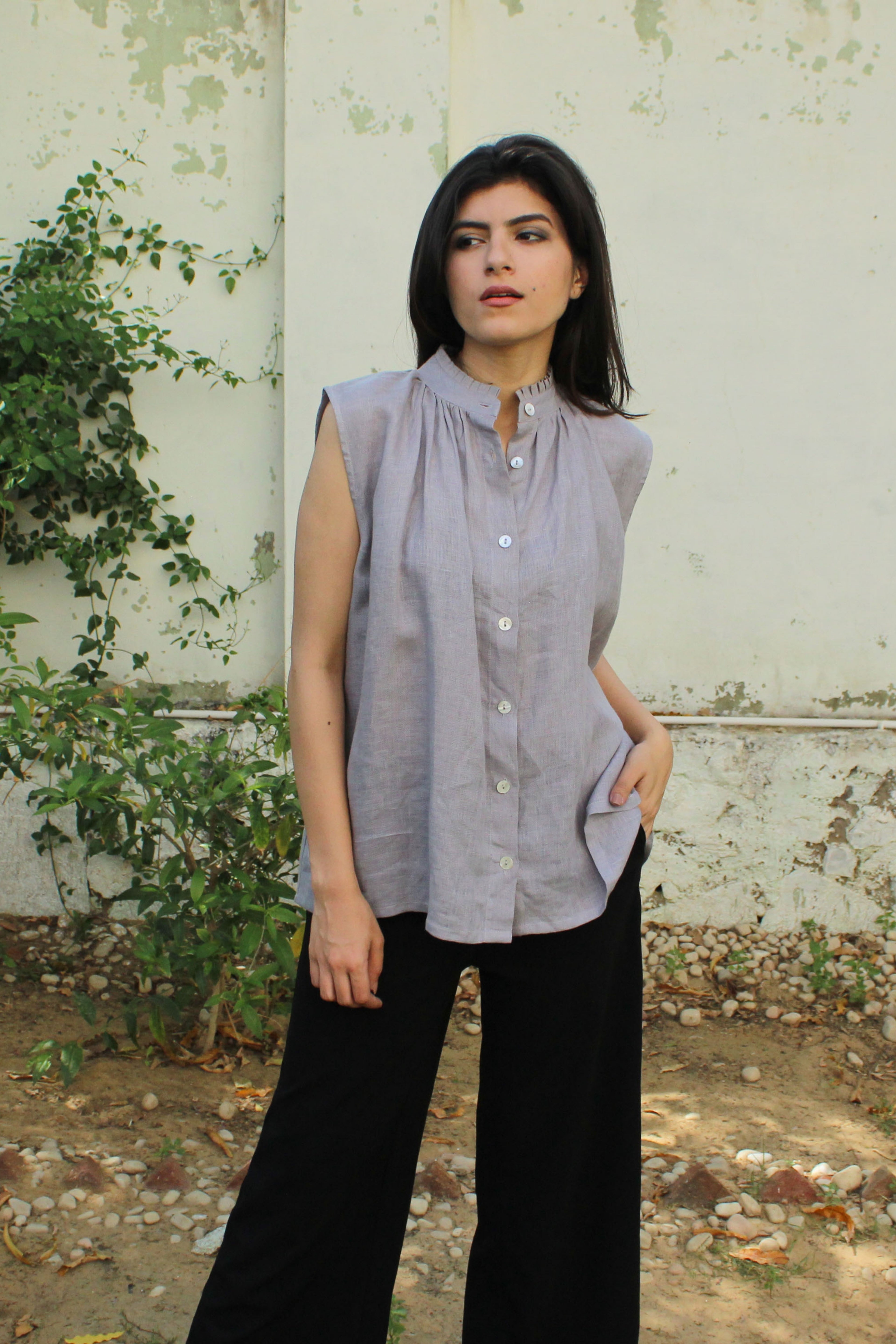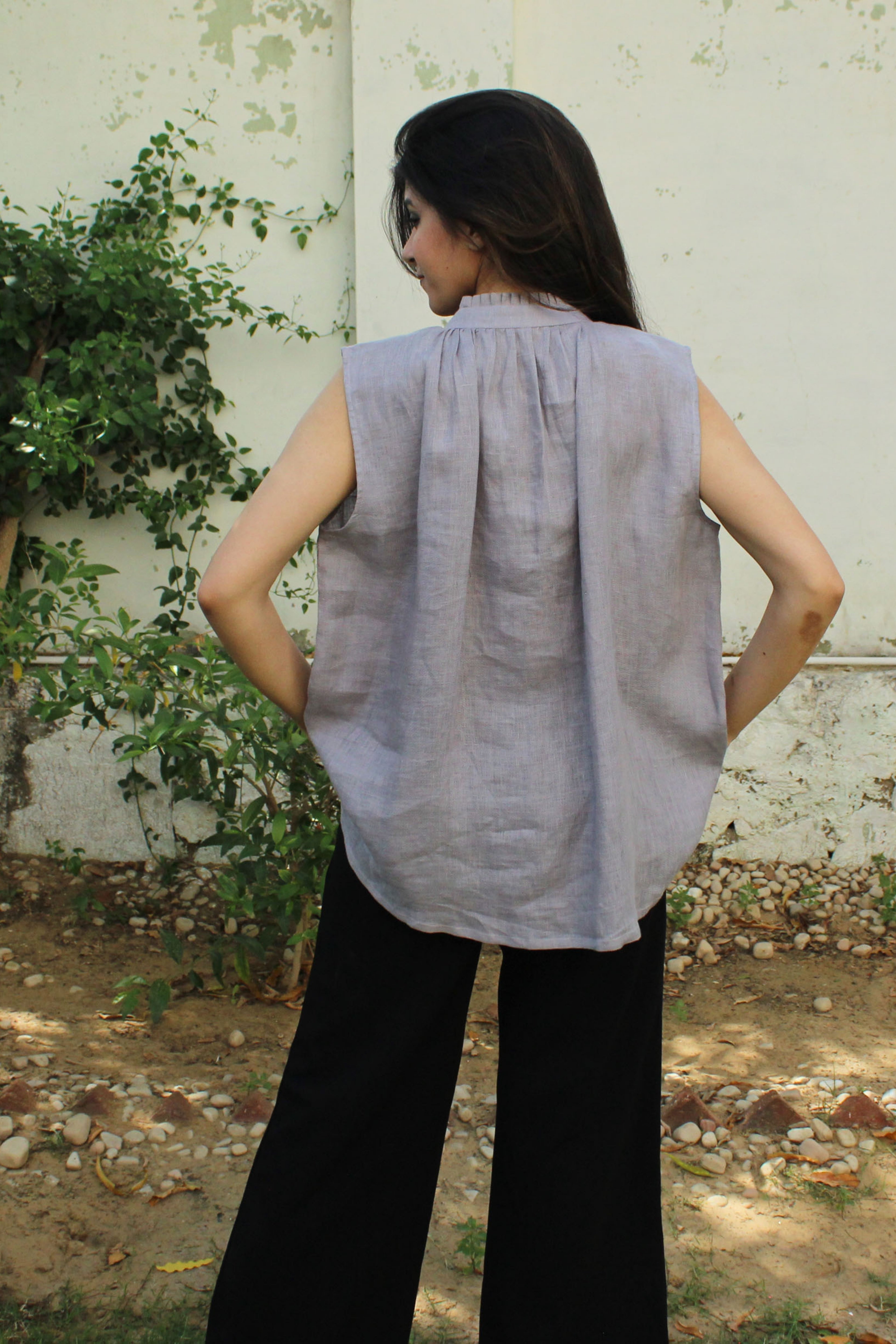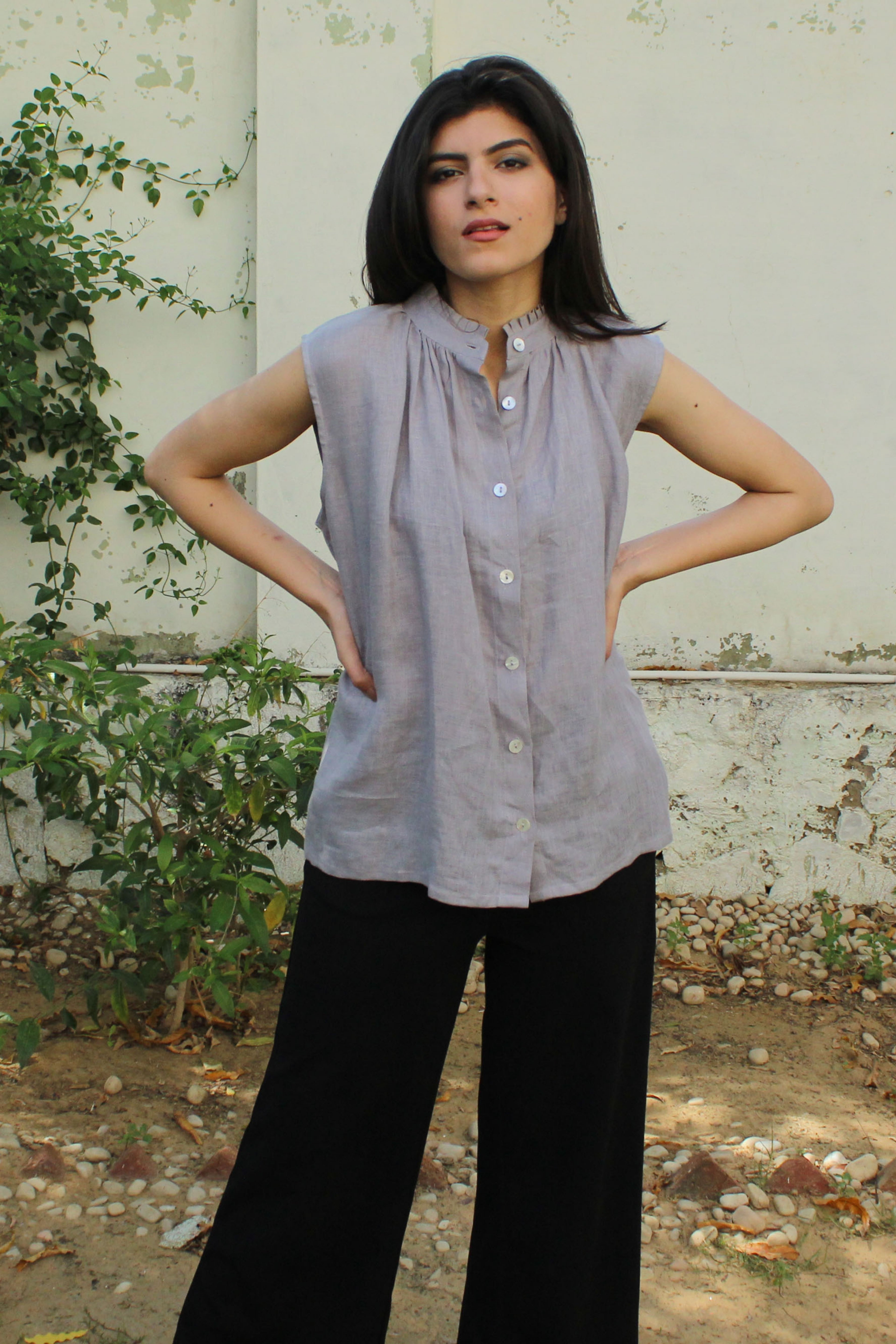 This light grey sleeveless linen top features a button-down front and a gathered neckline, combining breathable fabric with refined detailing. Its sleeveless design ensures comfort and ease during warmer days, while the gathered neckline adds subtle texture and visual interest. Perfect for layering or wearing alone, this top offers a versatile, polished look suitable for both casual and professional settings.