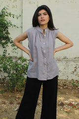 Light Grey Sleeveless Button Down Linen Top with Gathered Neckline