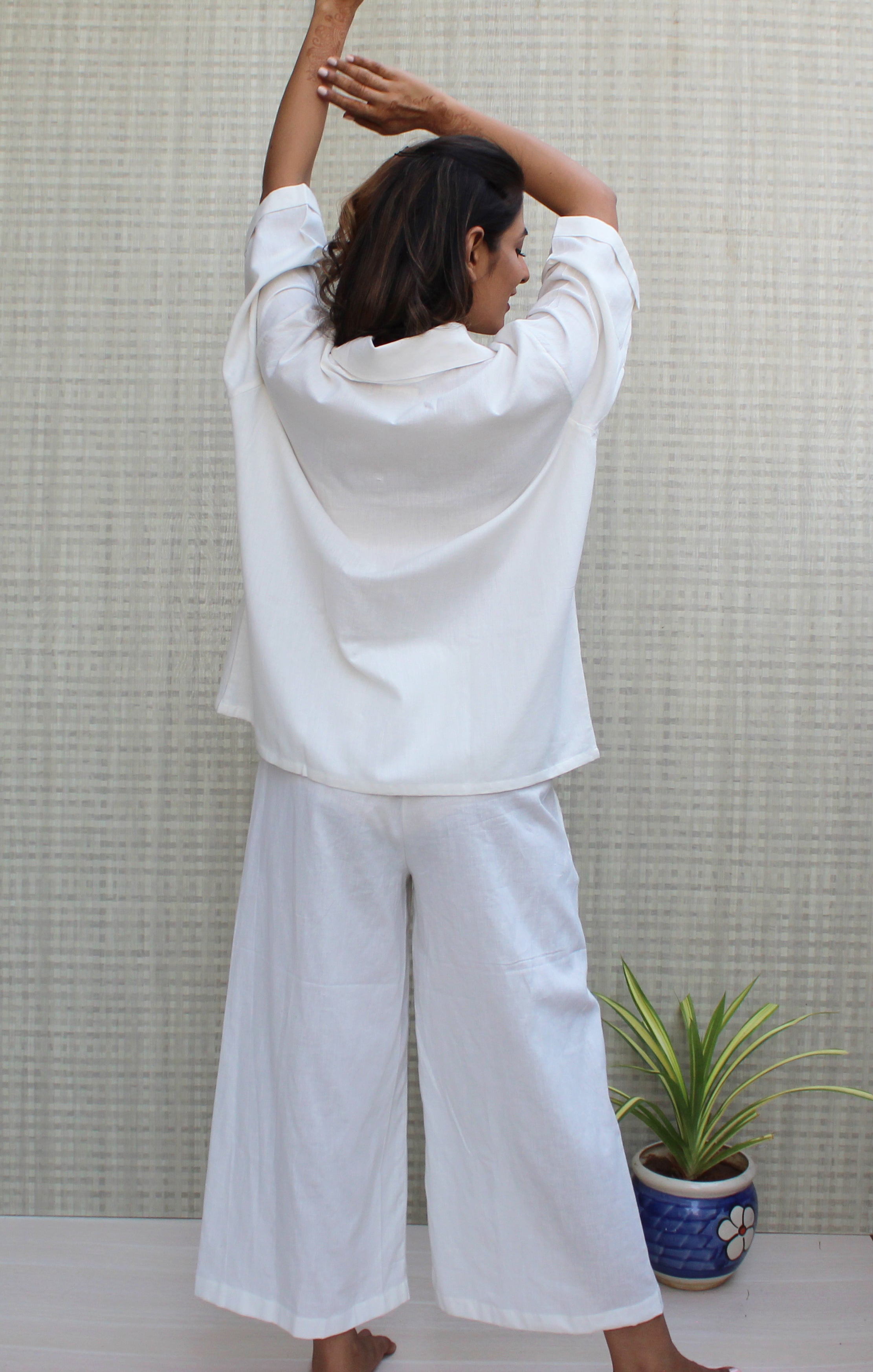 White Wide Leg Ankle Length Pants with Elastic Waistband