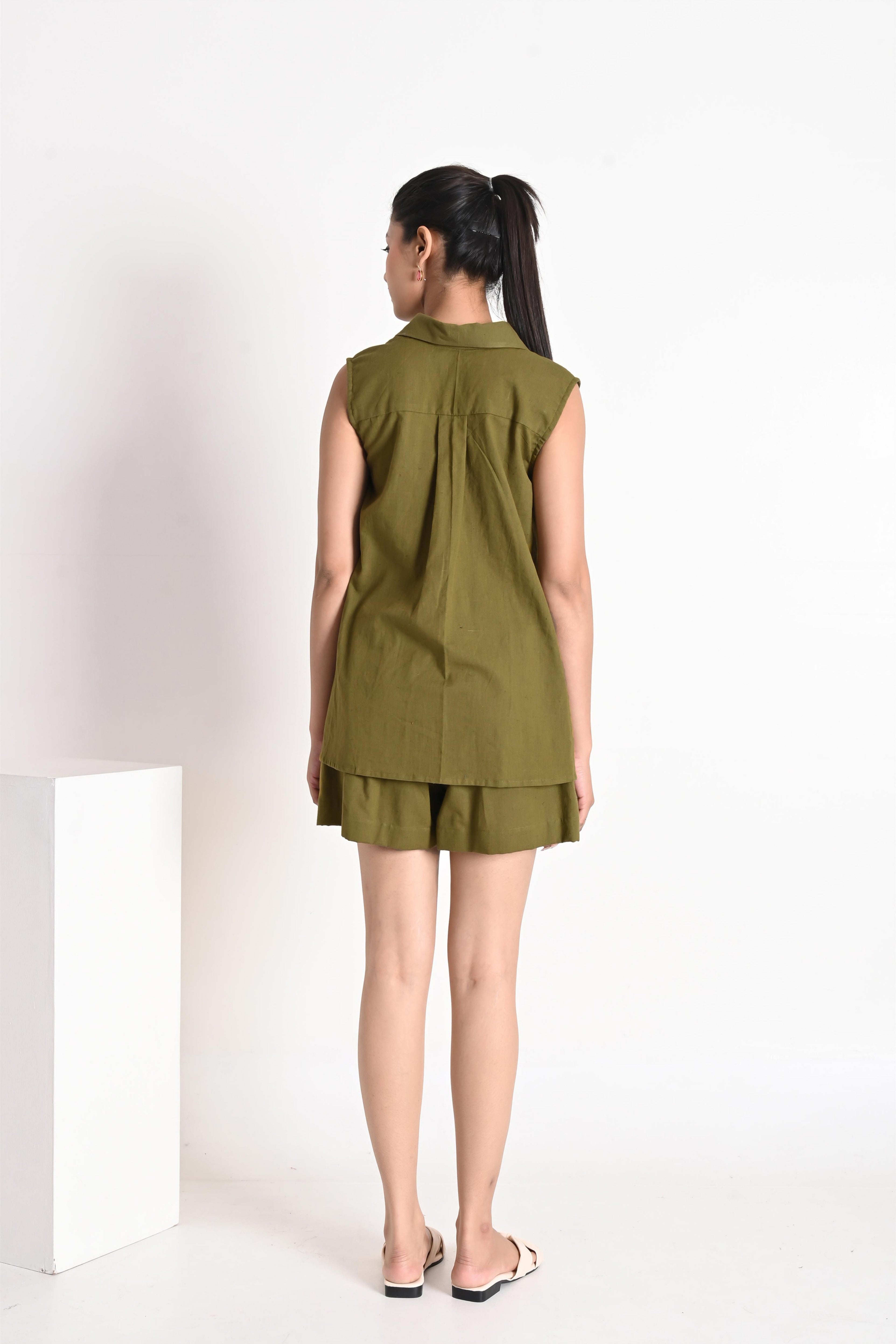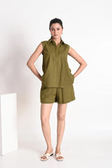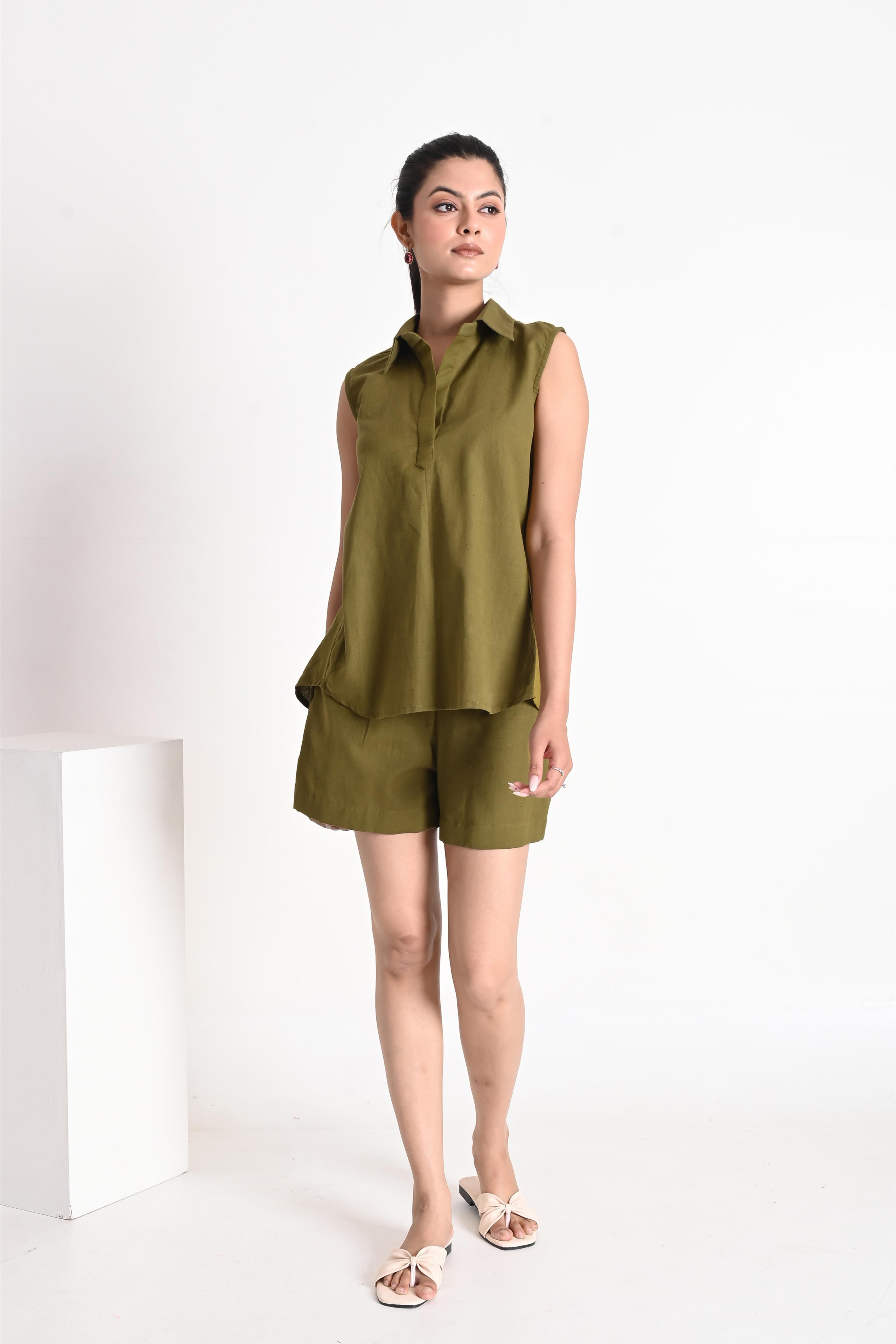 Moss Green Linen Shorts with Folded Hem and Elasticated Waist