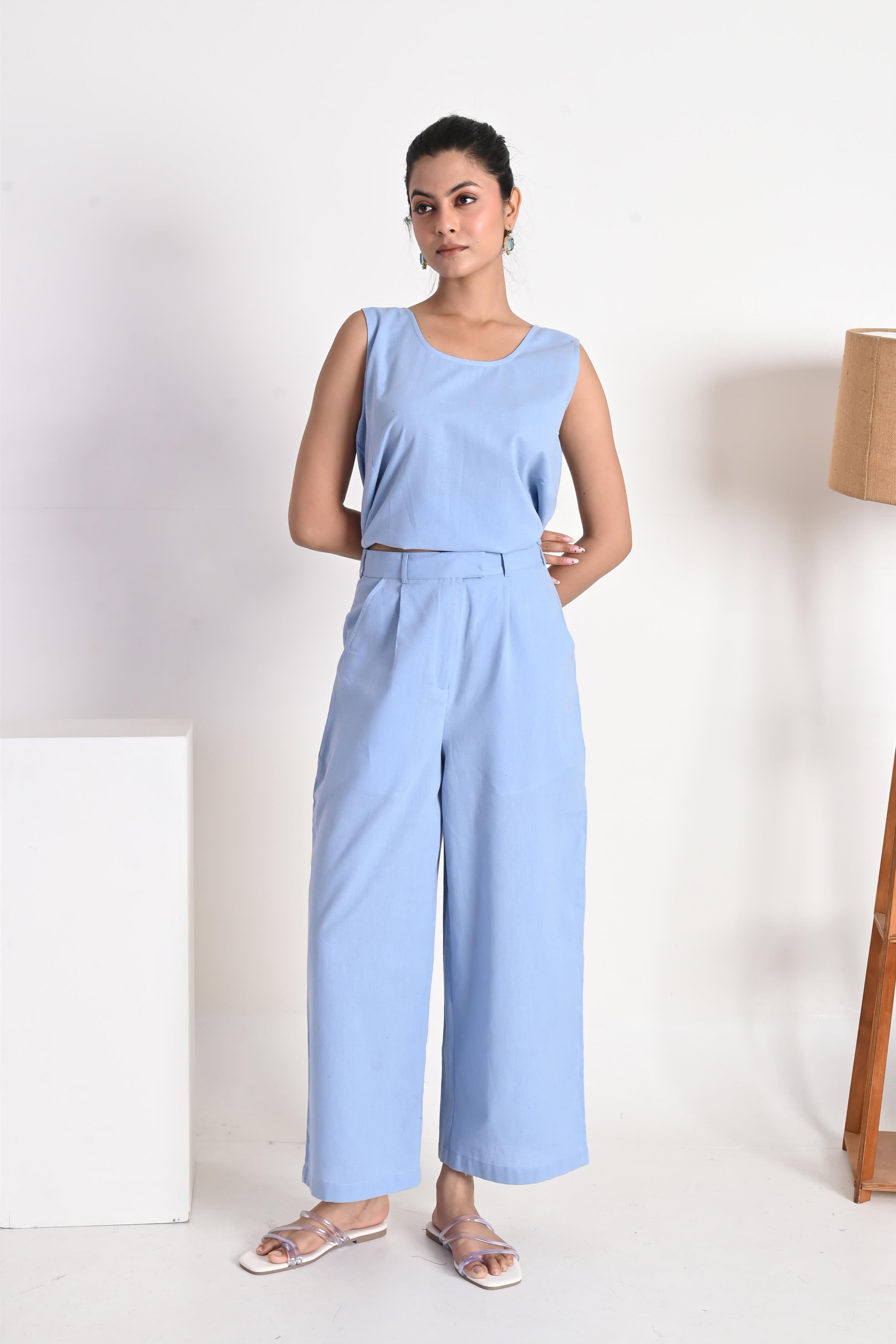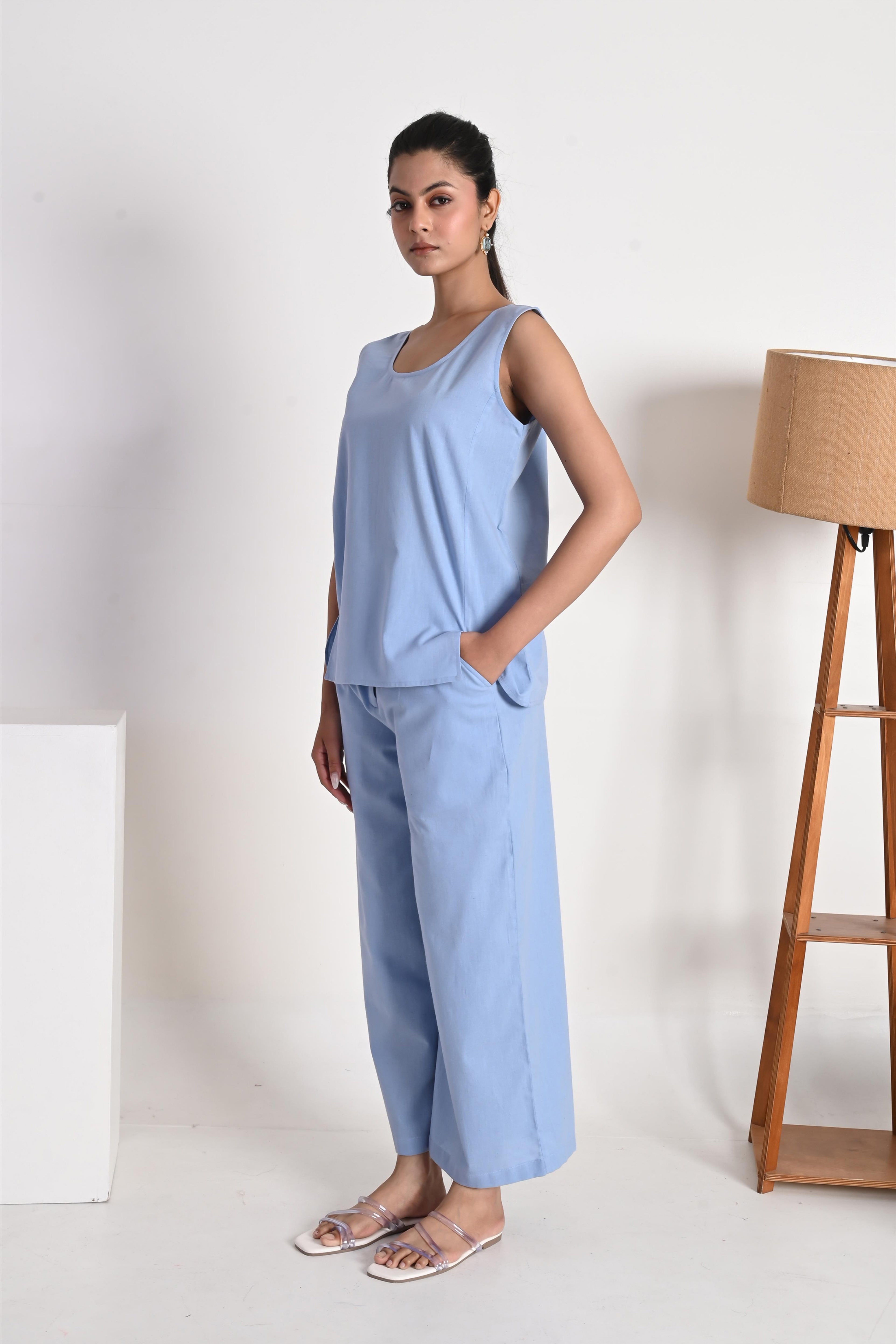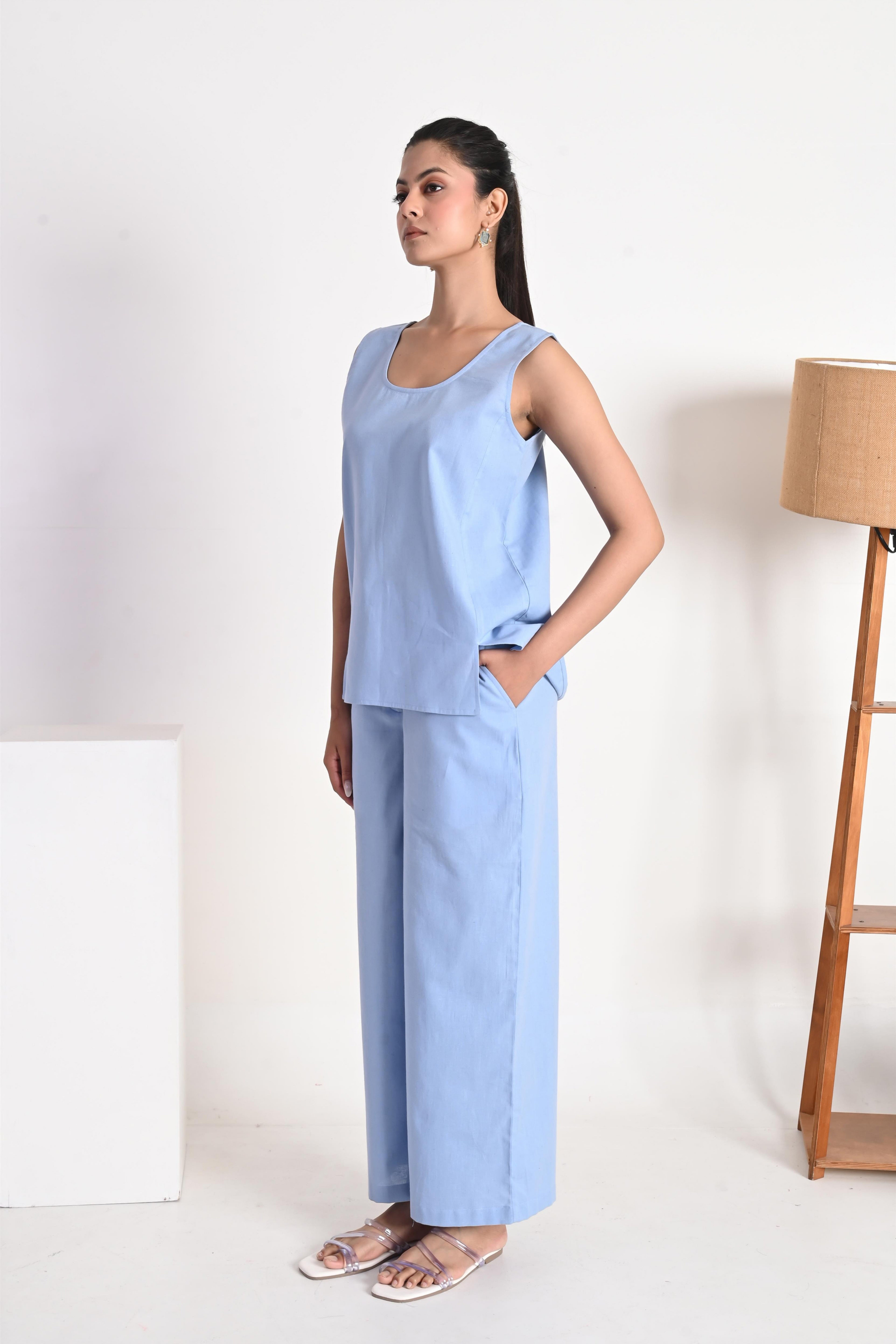 Muted Sky Blue Scoop Neck Linen Tank and Wide-Leg Pants Co-ord Set